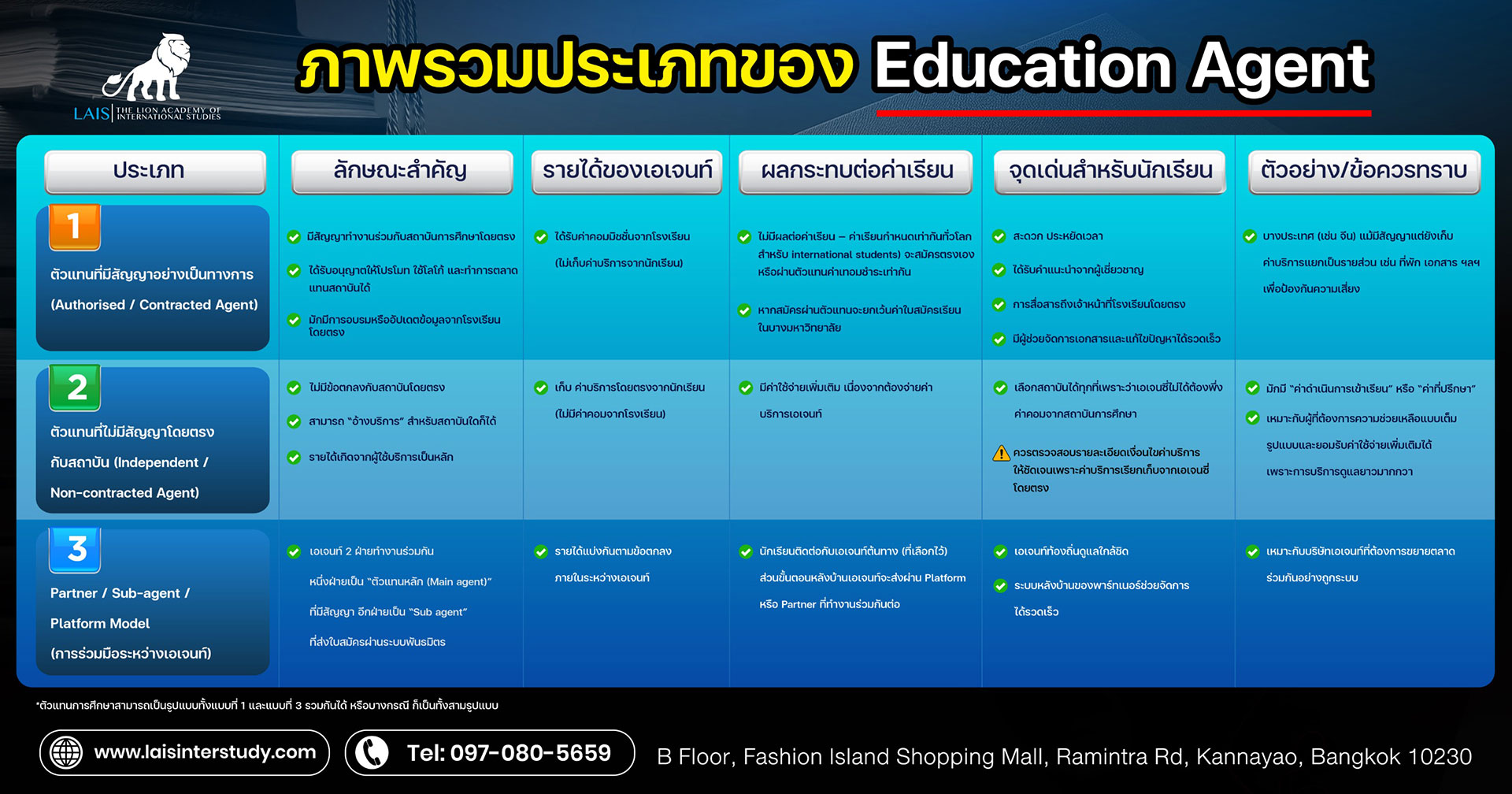 ข้อควรจำ—สุดท้ายแล้ว ที่ไหนและสาขาอะไรที่คุณจะเรียน คือ “การตัดสินใจของคุณเอง” เอเจนต์การศึกษามีหน้าที่ช่วยให้คุณตัดสินใจได้อย่างมีข้อมูล ไม่ใช่ ตัดสินใจแทนคุณ คุณควรเปิดใจรับคำแนะนำของเอเจนต์ได้ แต่ต้องยืนบนความต้องการของตัวเองเป็นหลัก หากคุณรู้สึกว่าไม่ได้รับบริการที่ดี คุณสามารถติดต่อสถาบันที่คุณสมัครโดยตรง หรือขอคำแนะนำเพื่อเปลี่ยนไปใช้อีกเอเจนต์ และให้เขาช่วยตรวจสอบปัญหาได้